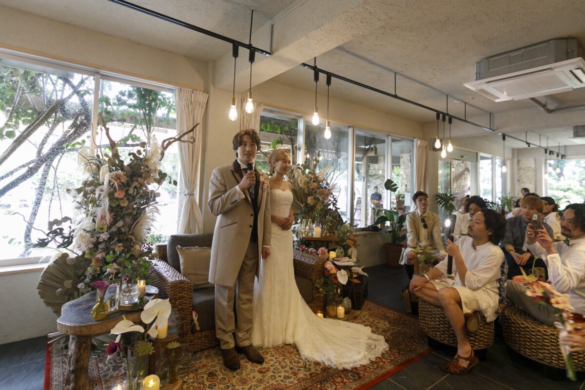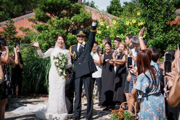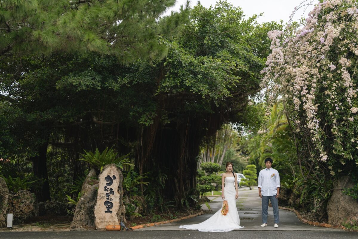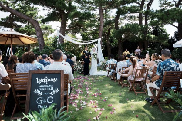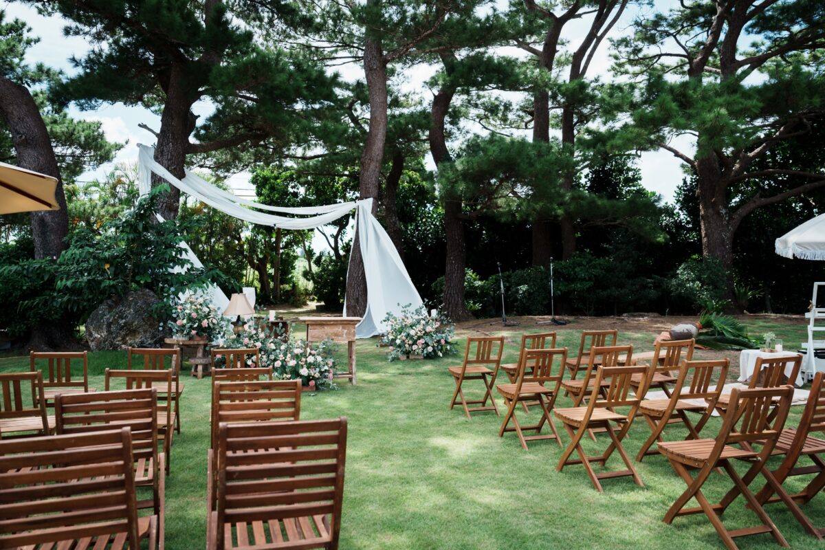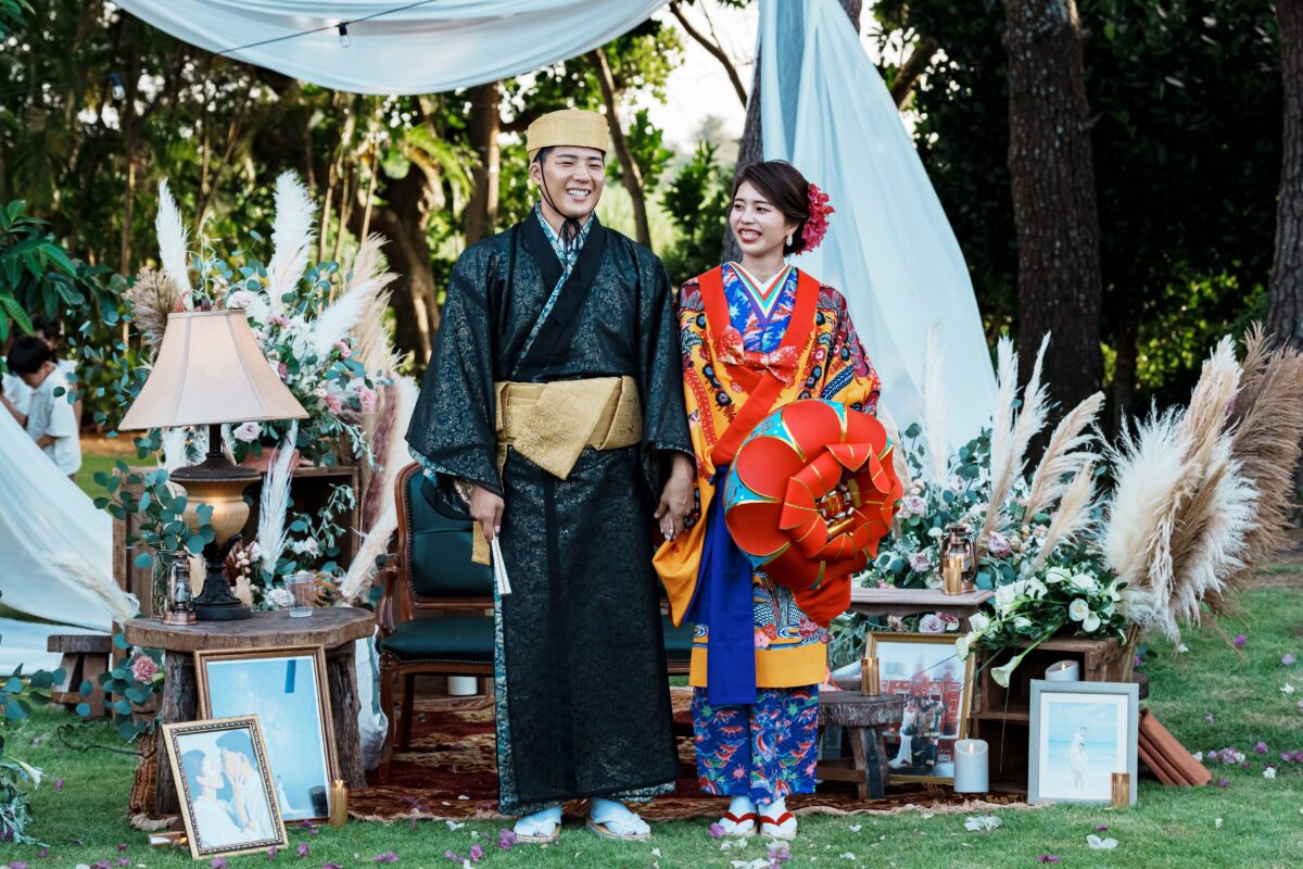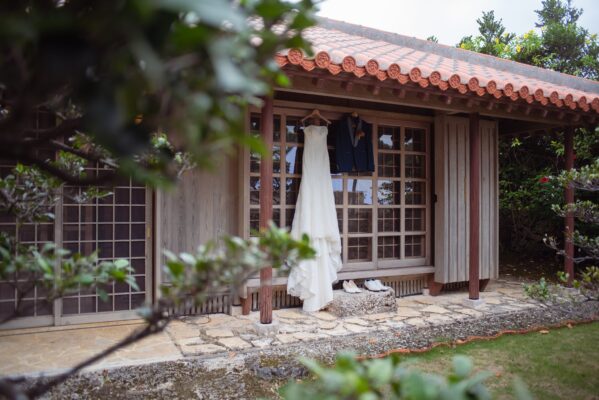 沖縄伝統 琉球赤瓦の家屋7棟の中心にあるお庭で結婚式パーティーをお届けします。