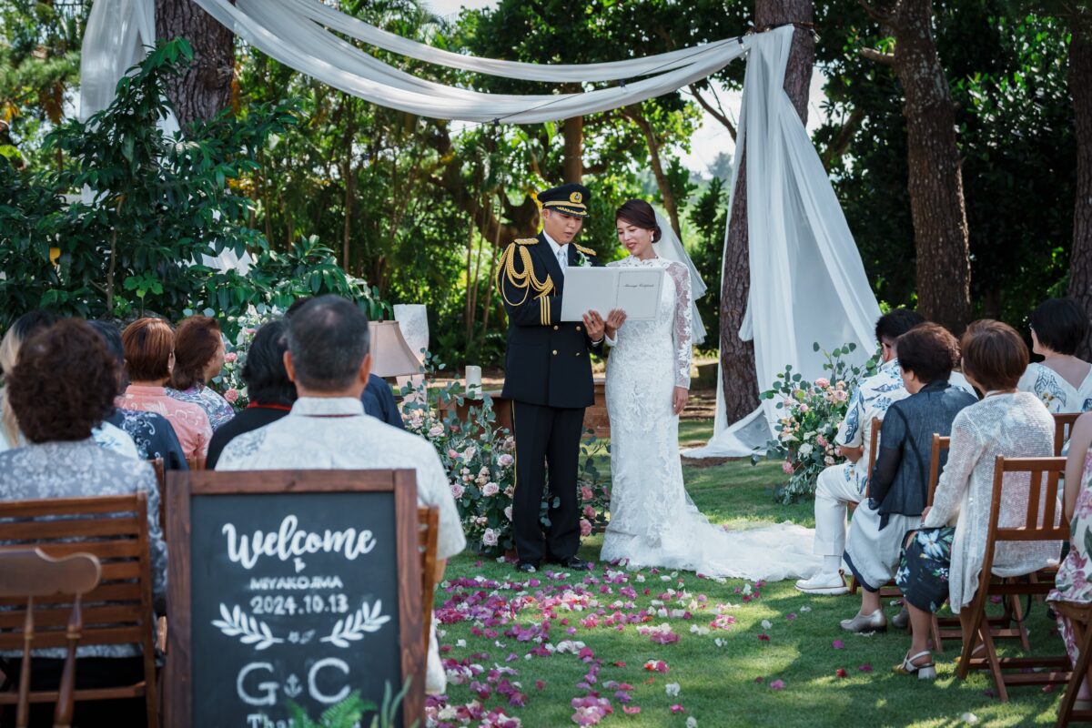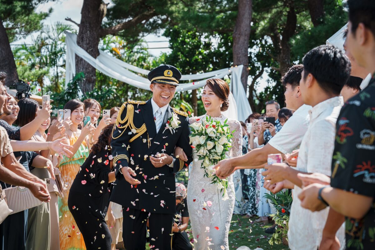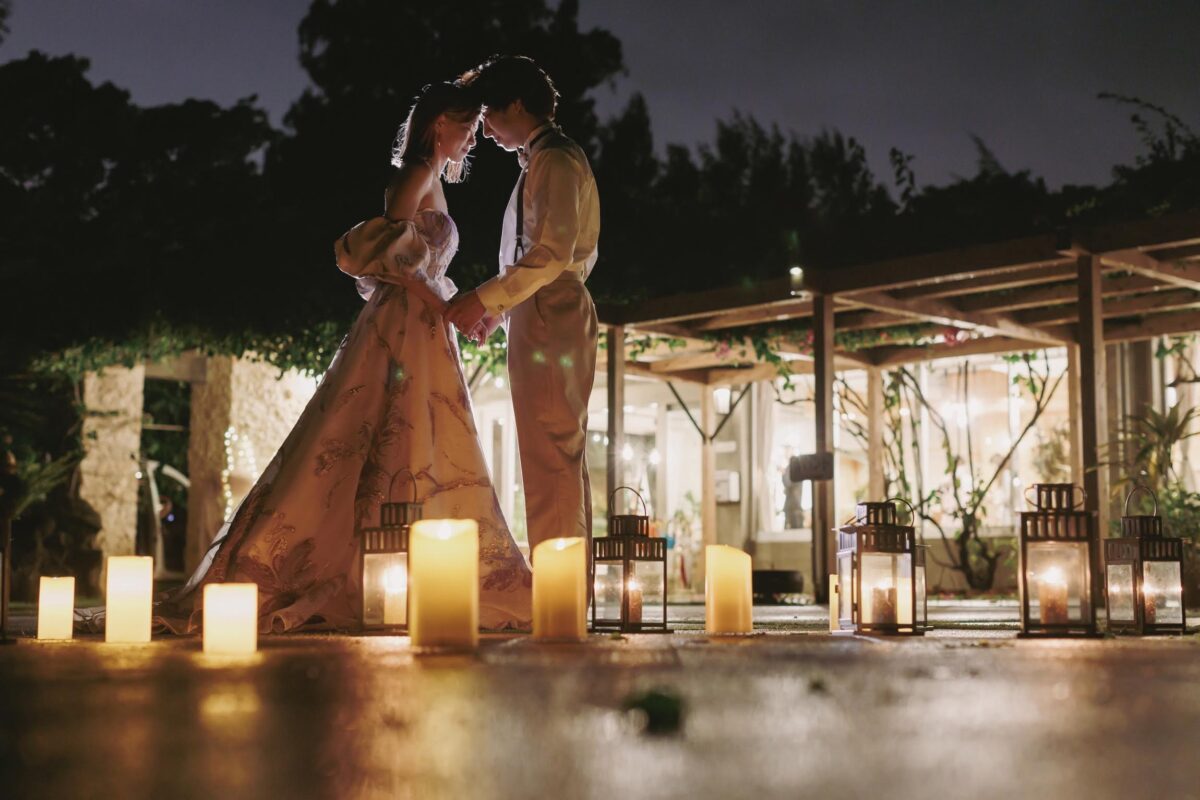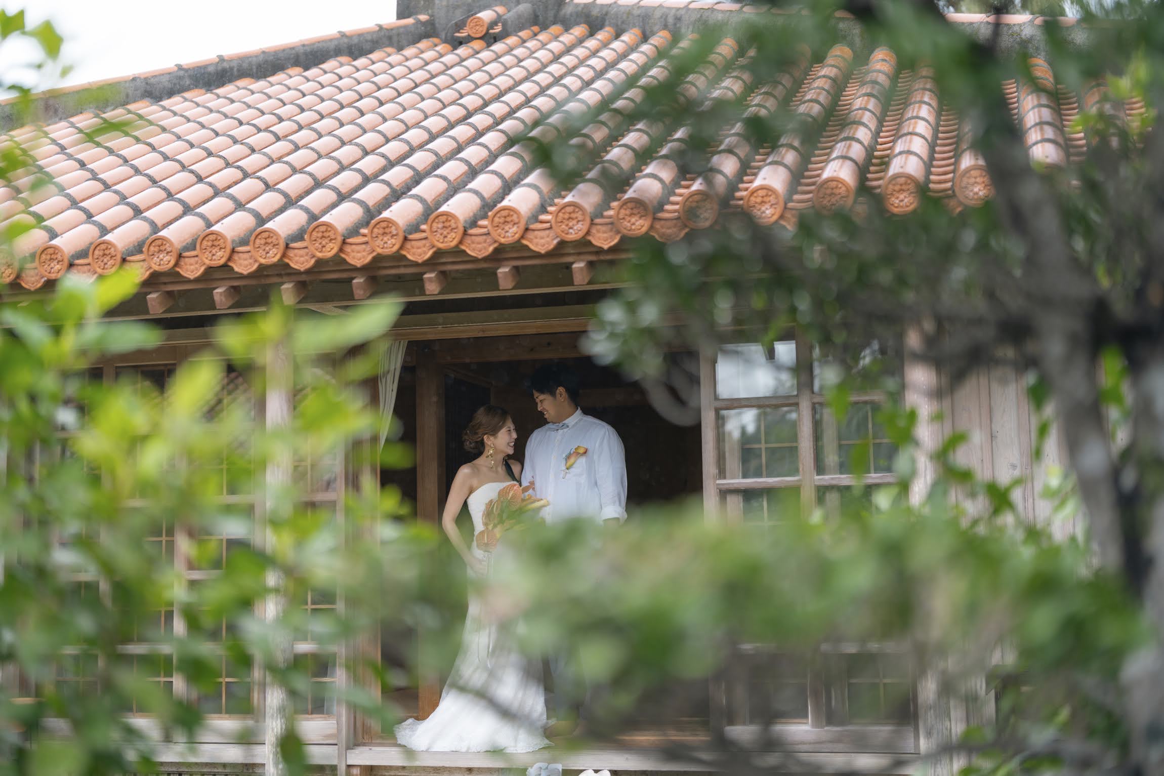 沖縄伝統 琉球赤瓦の家屋7棟の中心にあるお庭で結婚式パーティーをお届けします。