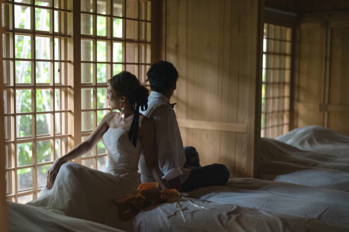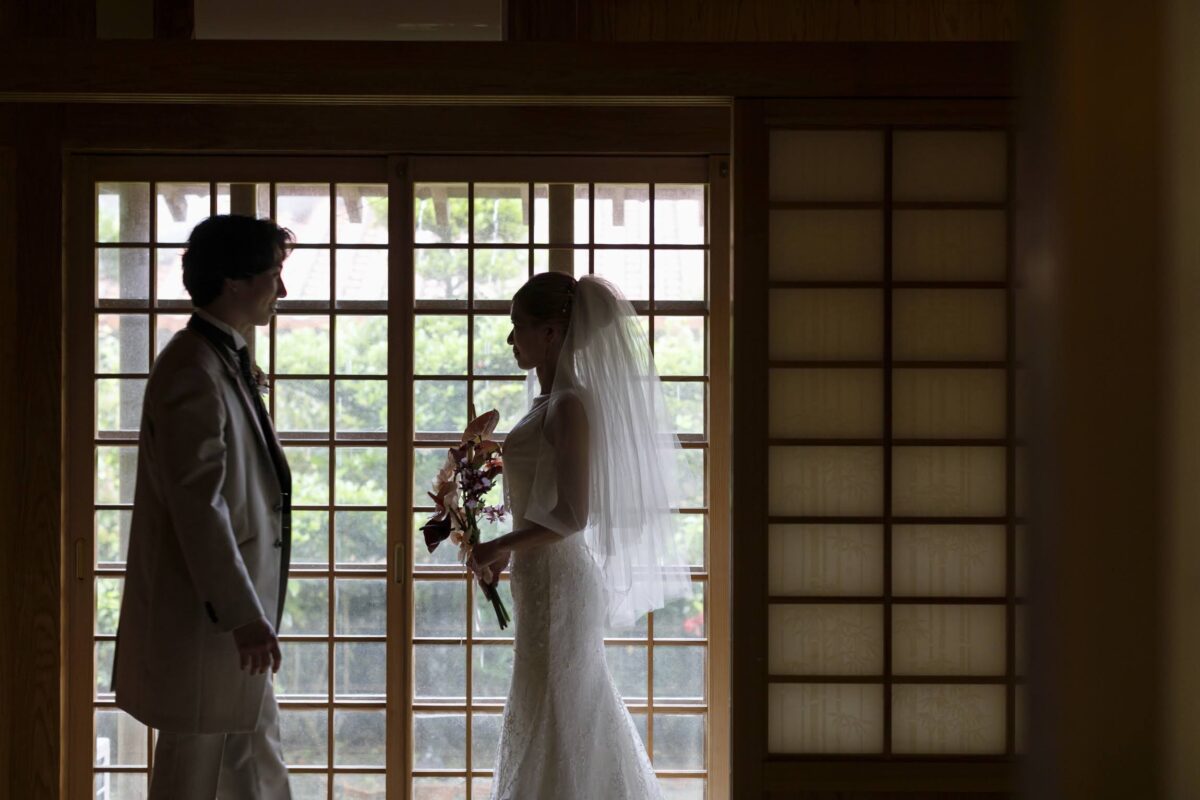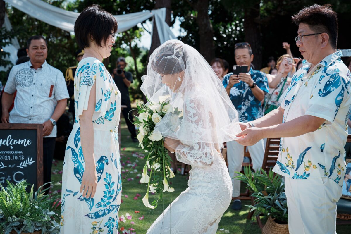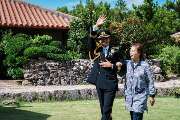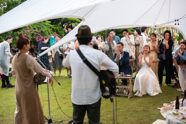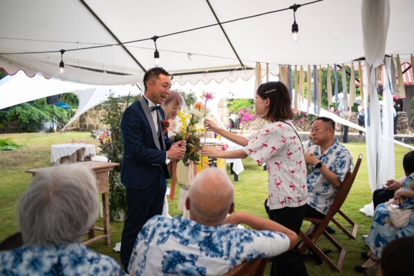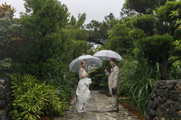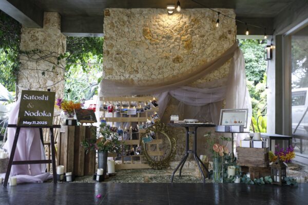 沖縄伝統 琉球赤瓦の家屋7棟の中心にあるお庭で結婚式パーティーをお届けします。